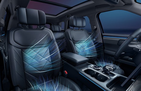 Artificial leather seats with heated/ventilated functions, dual-zone climate control, panoramic sunroof, and 64-colour ambient lighting create a premium cabin experience.
